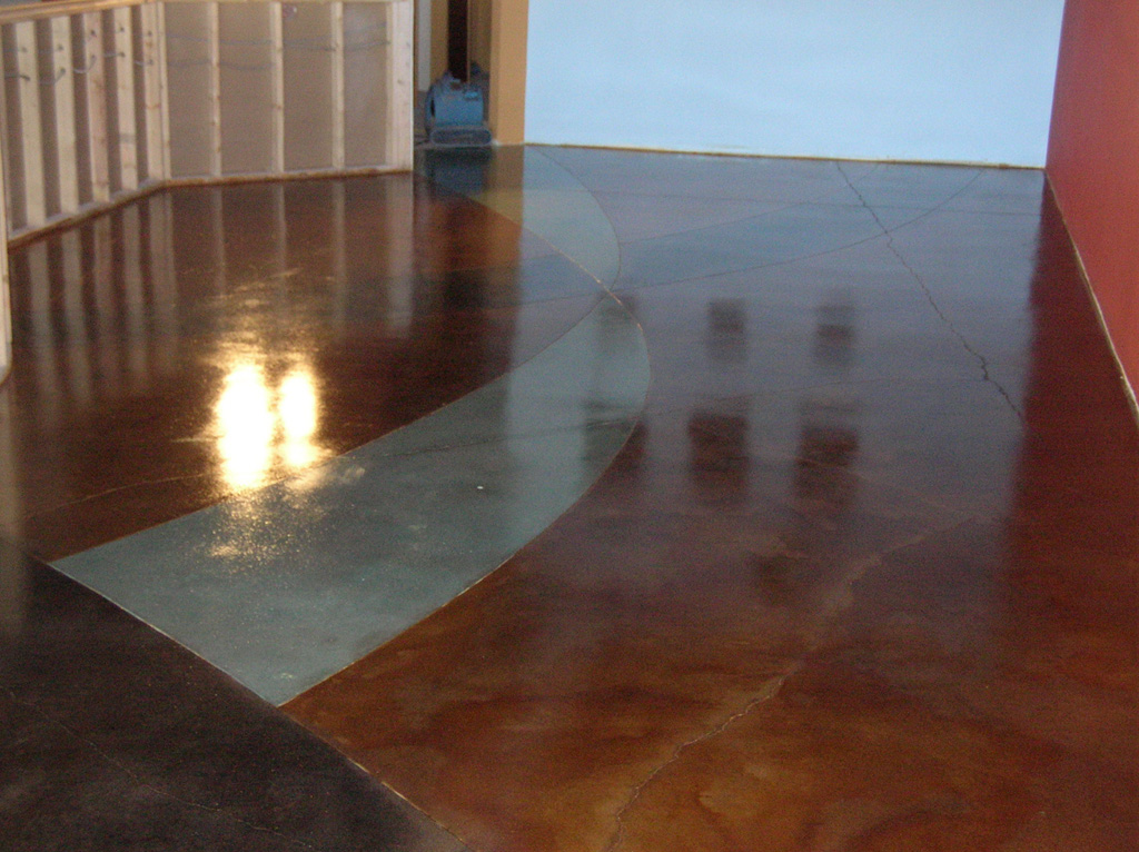 Acid stain is a solution made with water, hydrochloric acid, and acid-soluble metallic salts that react with minerals already present in the concrete. The result of this reaction is beautifully colored concrete that works very well on concrete, new or old concrete.